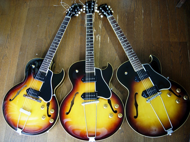 右三つは右から、Gibson ES-330 1962年製、Gibson ES-330 1963年製、Epiphone Casino 1961年製です。まんなかは、オリジナルビグスビー仕様で、たいへん希少です。61年はCasinoの発売年なので、このCasinoも記念すべき一体です。