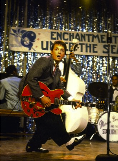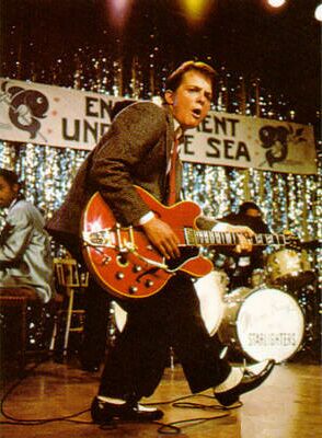 春木くんがこのごろライブで使ってるギター(GIBSON ES-345 1964年製)ってこれと同じ。マイケル・Jフォックスが映画で使ってるのは一見ES-355に見えるのですがヘッドインレイ、ペグなどからES-345と判断できます。ビグスビーはおそらくファクトリー仕様、1961年製です。面白いのが映画の設定は1955年ですがこの当時、これらのギターはまだ販売されておりません。映画の中でマイケル・J・フォックスが演奏中におそらくマーヴィン・ゲイと思われる人物がチャックベリーと思われる人物に電話をしてジョニービーグッドを聞かせます。なのでチャックベリーにささげるオマージュでこのギターを使用したのでしょう。とりあえず、僕はこの映画が大好きなので、ギターの機種に限らずなんともうらやましいです。でも僕はこの色は似合わないんですよ。。。(チロリ)